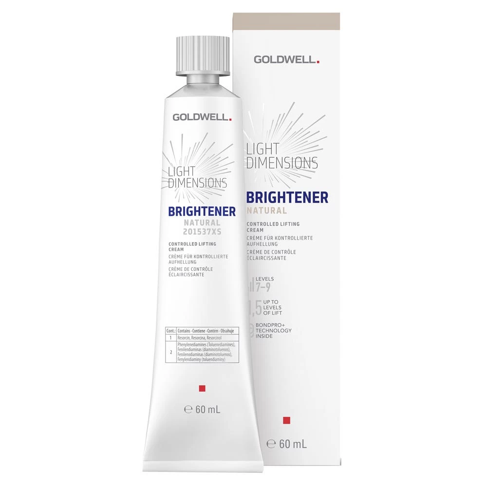 Der Goldwell Light Dimensions Brightener Natural ermöglicht ein fünf Minuten Strähnen Upgrade mit Aufhellung bis zu 1,5 Tonhöhen und kontrollierenden Pigmenten, um starke Kontraste zu reduzieren. Empfohlen für Tonhöhen 7–9.