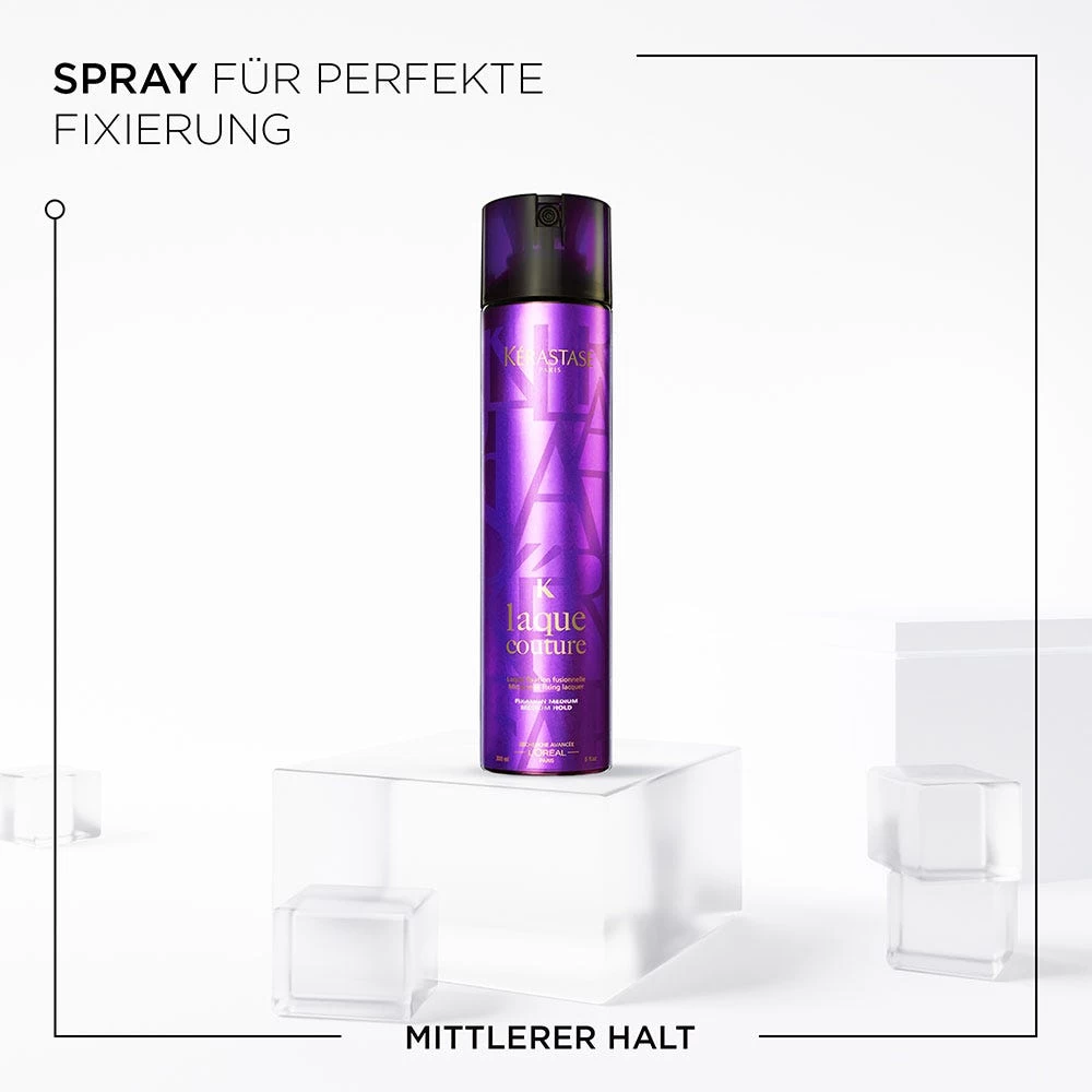Das Finish-Spray Kérastase Couture Styling Purple Vision laque couture verschmilzt mit dem Haar für eine perfekte Fixierung und verleiht dem Haar festen Halt, Glanz und verhindert Anti-Frizz. Durch den Micro-Diffuser und Treibmittel entsteht eine microfeine Zerstäubung ohne sichtbare Rückstände.