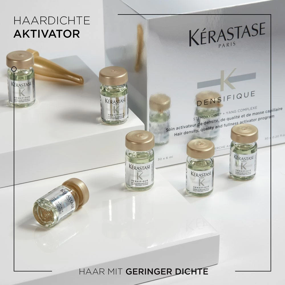 Der Kérastase Densifique Haardichte-Aktivator aktiviert das Regenerationspotential der Stammzellen für dichteres Haar. Nach einer kontinuierlichen Anwendung von 3 Monaten erweckt er bis zu 1.700 Haare zu neuem Leben. Das Umfeld der Stammzellen wird für sie optimiert und so entstehen neue Haare. Das texturisierende Polymer sorgt für spürbar mehr Haarfülle. Außerdem wirkt das Haar stabiler, kräftiger und vitaler.