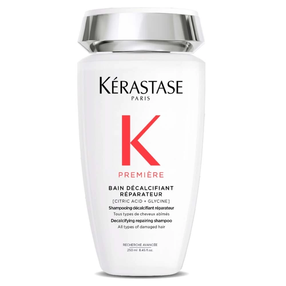 Das Kérastase Première Bain Décalcifiant Rénovateur, das von innen und außen wirkt, um überschüssiges Kalzium zu reduzieren und geschädigtes Haar zu stärken und zu reparieren.