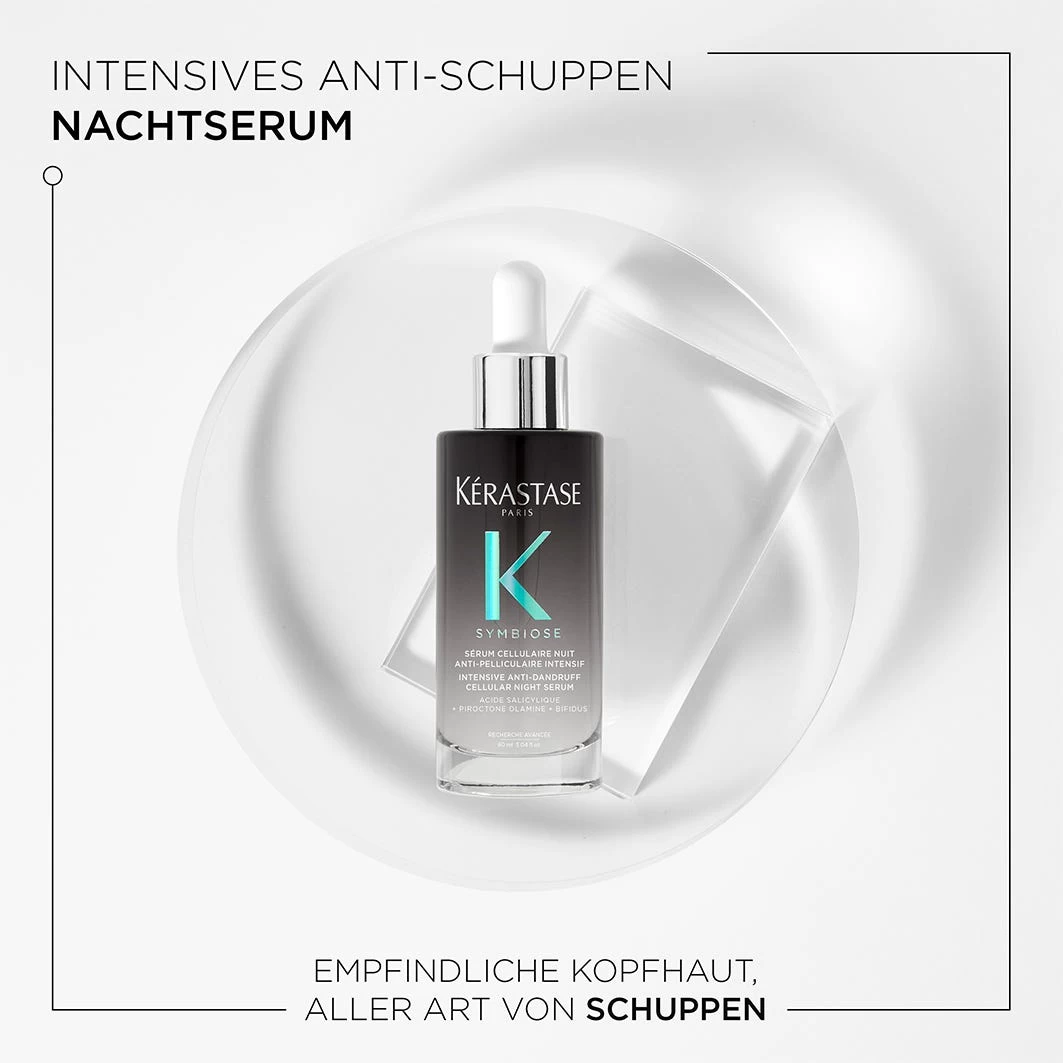 Das Kérastase Symbiose Sérum Cellulaire Nuit stärkt die Kopfhautbarriere innerhalb von 8 Stunden über Nacht und reduziert sichtbare Schuppen – ohne Sulfate oder Silikone. Bifidus Extrakt beruhigt die sensible Kopfhaut und unterstützt das natürliche Mikrobiom. Pirocton-Olamin und Salicylsäure entfernen sofort Schuppen sichtbar und reduzieren langfristig die Bildung neuer Schuppen.