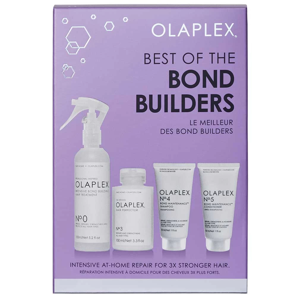 Das Olaplex Best of Bond Builders Set ist ein 4-teiliges Set bestehend aus OLAPLEX N°.0 Intensive Bond Building Hair Treatment und OLAPLEX N°.3 Hair Perfector für die wöchentliche Anwendung zur Reparatur aller Haarschäden. Zusätzlich enthält das Set zwei Bestseller in Reisegröße – OLAPLEX N°.4 Bond Maintenance Shampoo und OLAPLEX N°.5 Bond Maintenance Conditioner, die Frizz und Schäden vorbeugen und Feuchtigkeit spenden.