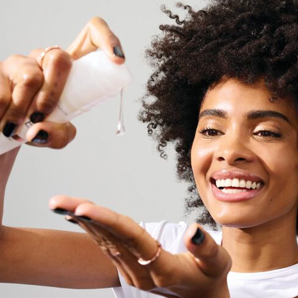 Trage als ersten Schritt deiner Styling-Routine eine kleine Menge auf das feuchte Haar auf und arbeite dich von den Spitzen zum Ansatz vor. Bei längerem, dickerem Haar nach Bedarf mehr verwenden.