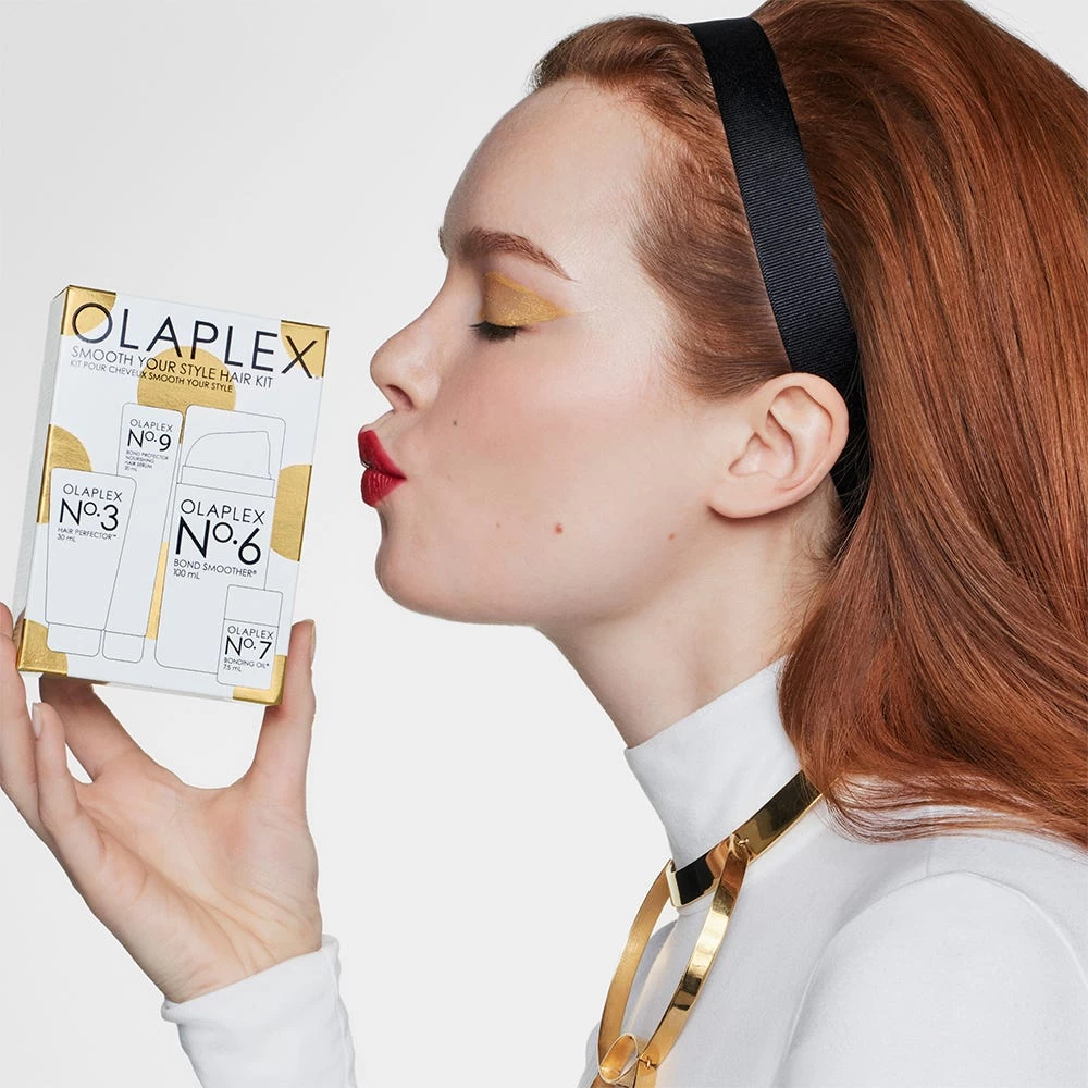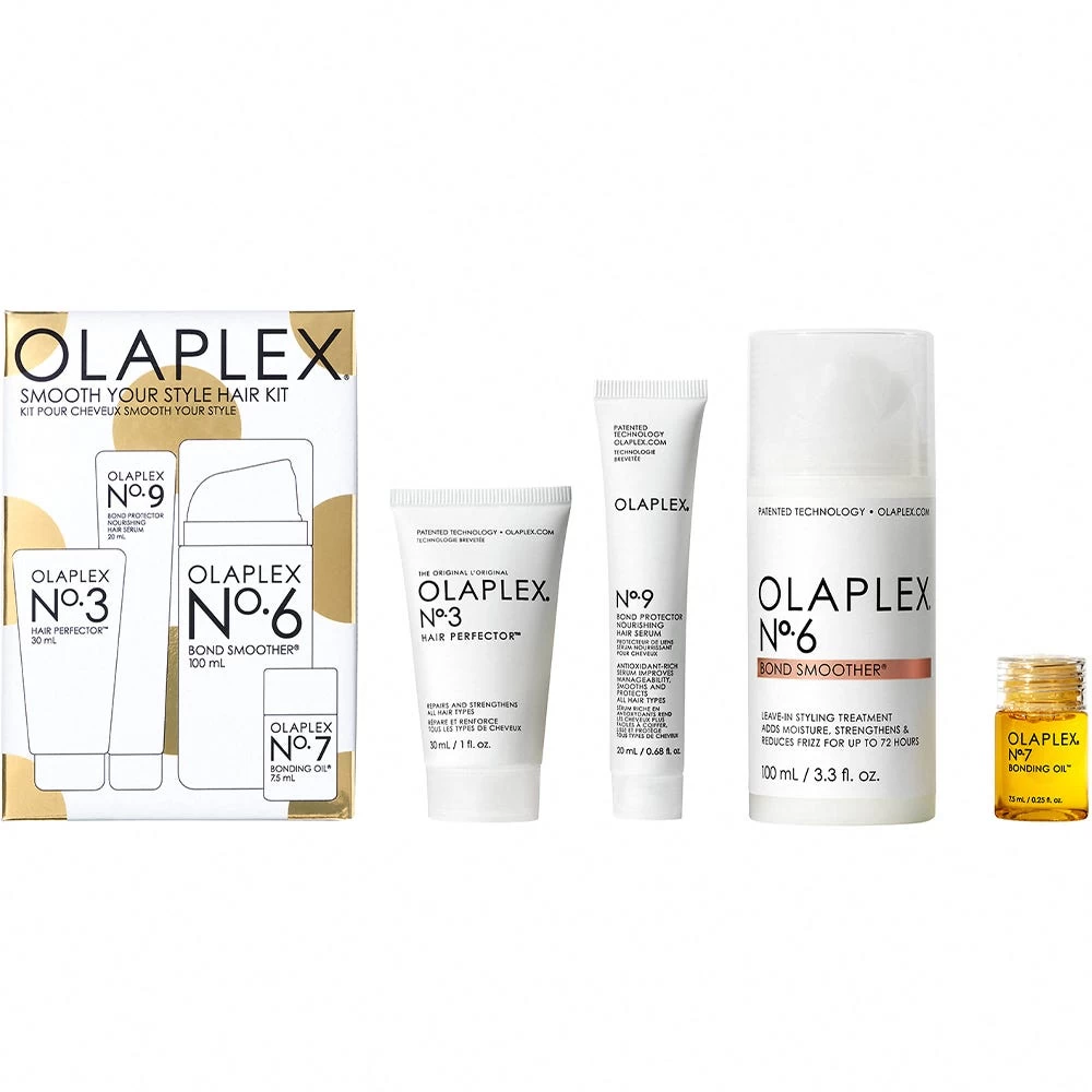 Das Olaplex Smooth Your Style Set ist ein Pflegeset zur Haupthaarpflege, bestehend aus dem Olaplex Hair Perfector No. 3 30 ml, den Olaplex No. 6 Bond Smoother Airless Pump 100 ml, dem Olaplex No. 7 Bonding Oil 7,5 ml und dem Olaplex No. 9 Bond Protector Nourishing Hair Serum 20 ml.