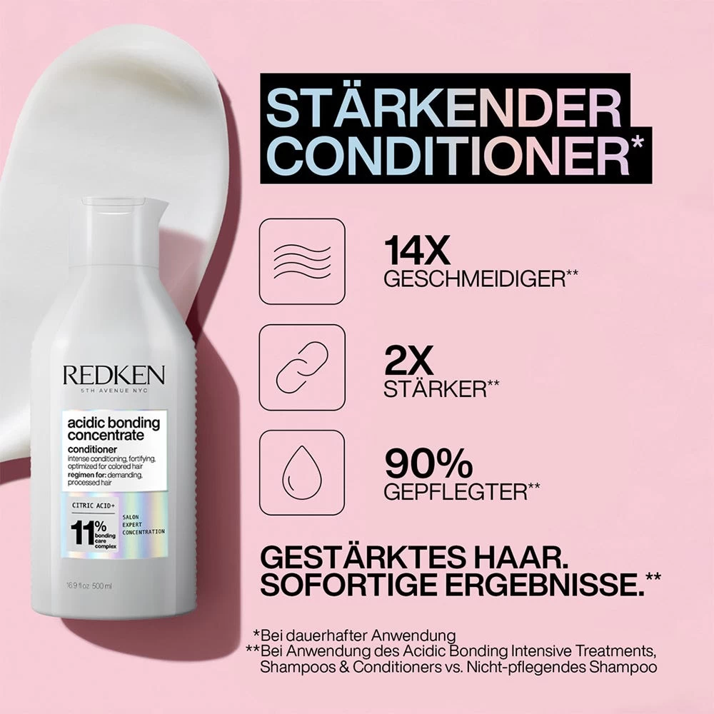 Der Redken Acidic Bonding Concentrate Conditioner bietet die optimale Pflege für stark geschädigtes Haar. Dank der enthaltenen Zitronensäure und einem Bonding-Care-Komplex stärkt er geschwächte Brückenbindungen innerhalb der Haarfaser und baut das Haar somit von innen heraus wieder auf. Zudem versiegelt er die Schuppenschicht der Haare und sorgt somit für Schutz, Glanz und Geschmeidigkeit.