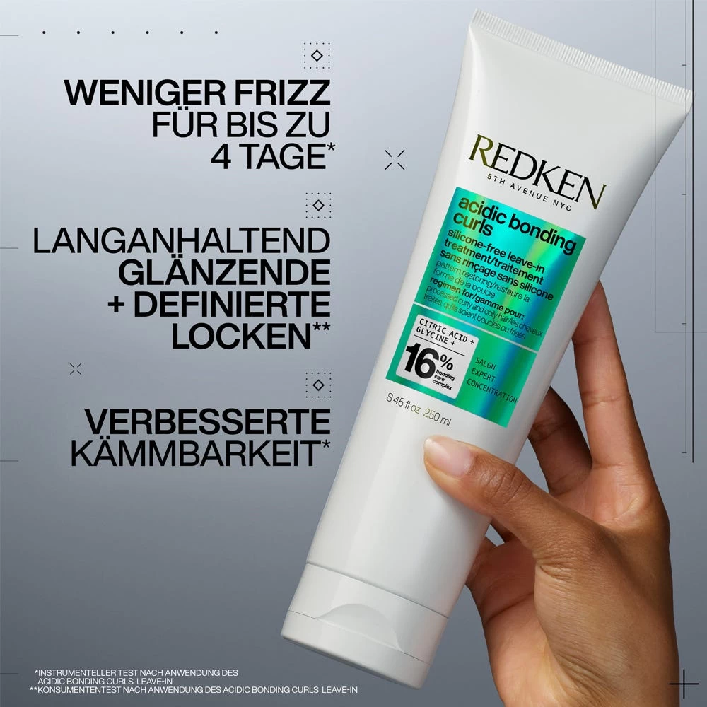 Das Redken Acidic Bonding Curls Treatment ist eine silikonfreie Leave-In-Pflege zur Regeneration der Struktur von behandelten, geschädigten Locken. Die ph-Wert ausgleichende und mit Zitronensäure, Glycin und Avocado-Öl angereichert Formel ist perfekt auf lockige und krause Haartypen abgestimmt und sorgt somit für einen sofortigen und tiefenwirksamen Regenerationseffekt. Dank des enthaltenen, hochkonzentrierten Bonding-Care Komplexes wird die Schuppenschicht des Haares versiegelt und die ursprüngliche Lockenstruktur wiederhergestellt. Zusätzlich bietet es einen Hitzeschutz bis zu 230°. Für gesündere, definierte und langanhaltend mit Feuchtigkeit versorgte Locken.