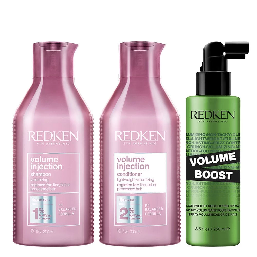 Die Redken Volumen-Boost Routine enthält volumenfördernde Haarpflege für besonders feines Haar. Das Stylingspray sorgt vorallem für einen verstärkten Ansatz und verleiht dem Haar Fülle. Das Set enthält ein Redken Volume Injection Shampoo 300 ml, ein Redken Volume Injection Conditioner 300 ml und ein Redken Styling Volumen Rootful 06 250 ml.