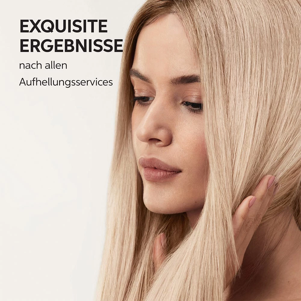 - Perfekt, um den naturfarbenen Ansatz sanft aufzuhellen bei gleichzeitiger Tönung der Längen und Spitzen. Gleicht Farbgrenzen an – für Premium-Blondergebnisse.