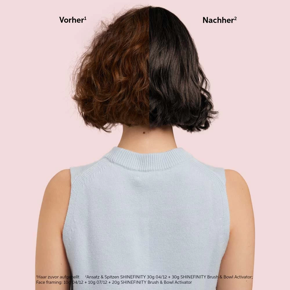 Geeignete Handschuhe tragen. Die Mischung kann mit Applikatorflasche oder Schale & Pinsel aufgetragen werden. Shinefinity gleichmäßig vom Ansatz bis in die Spitzen auf das gewaschene, handtuchtrockene Haar auftragen.